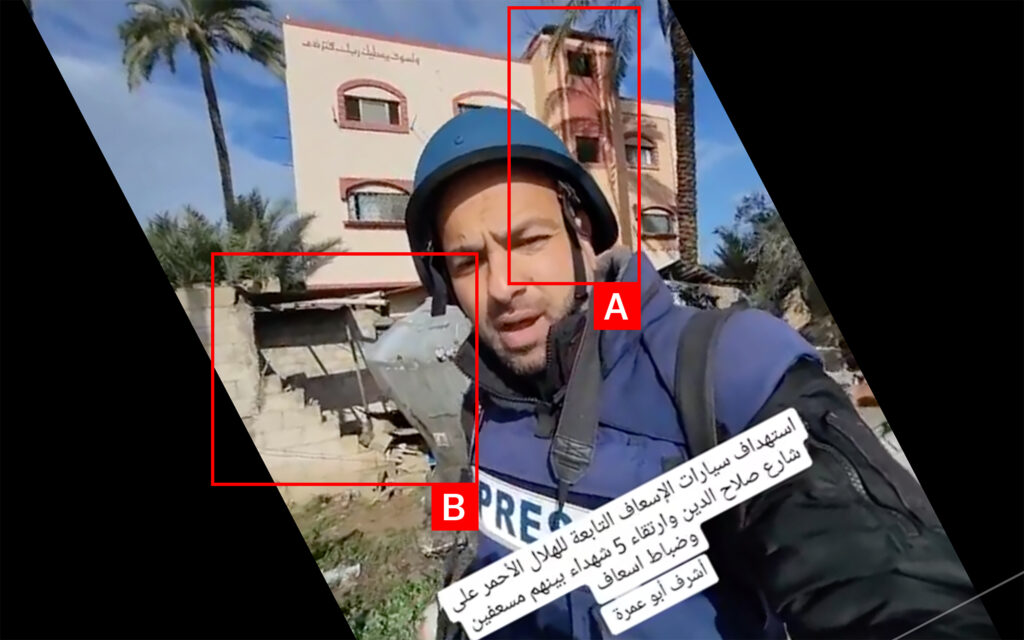 Reports of the incident mention an an ambulance of the Palestinian Red Crescent Society (PRCS) being struck on Salah al-Din Street (شارع صلاح الدين) in the vicinity of the town of Deir al-Balah (دير البلح). Analysing audio-visual material from sources, we have narrowed the location down to the following exact coordinates: 31.413871, 34.364627.