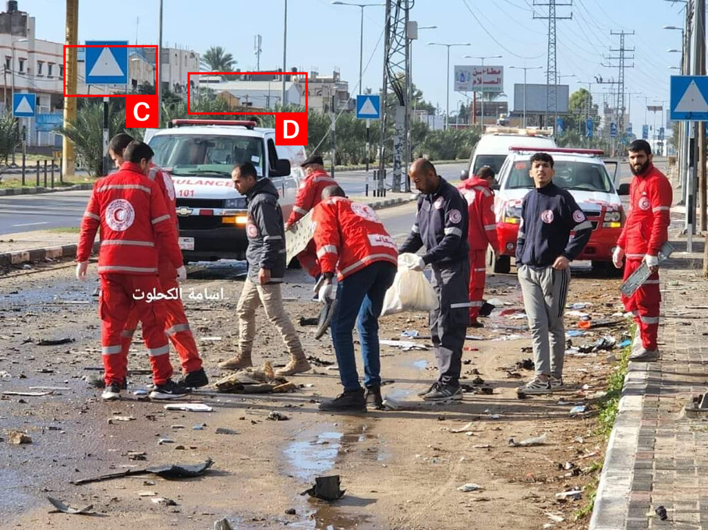 According to the PRCS, the ambulance had been on Salah al-Din Road, a highway running north-south through the Gaza Strip that has in the past been used by thousands of Palestinians fleeing the Israeli military advance. The members of the crew killed in the incident included the ambulance driver, Youssef Abdullah Muhammad Muammar, the paramedic Fadi Fouad Al-Maani, the first responder, 24-year-old Islam Abu Riala, and a volunteer photographer Fouad Abu Khammash.