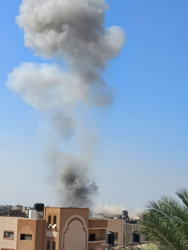 According to X/Twitter user PalpostN, warplanes were responsible for the strikes on the house, located near the Kuwaiti hospital. A photo from afar shows a large plume of smoke emerging from the refugee camp. The photograph indicates the strike took place during the day as the skies are blue and the sun is high.