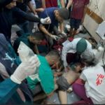 In another video, an ambulance arrives at the emergency entrance of Al-Aqsa Martyrs Hospital, where paramedics are seen removing body fragments from the back of the vehicle. The video shows at least four children, all appearing to be under ten years old, in excruciating pain and shock as they are treated for wounds. “I beg you, I can’t take it anymore” says one of the children, bleeding from his head with visible burns on his face and arms.