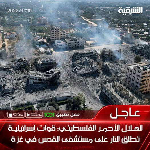 Rassd News Network, quoting a statement made by the Red Crescent, reported that the Al-Quds Hospital housed medical staff, patients and more than “14,000 displaced people”, many of whom were injured. In a video shared on Facebook by Al Arabyia, Palestinian Red Crescent media officer Nibal Farsakh appeared in a video – speaking toward the camera she reports on the incident. The comment read, “Palestinian Red Crescent media officer Nibal Farsakh said: The hospital is completely surrounded and the intensive care unit was targeted. #AlArabiya”.