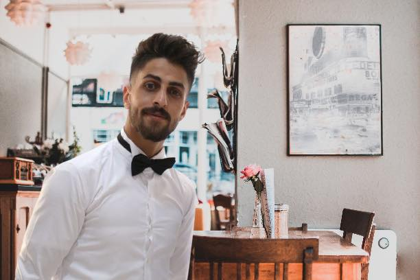 Facebook account Nuseiratcity posted an image of Tawfiq Badwan with his son Anas. Tawfiq was an elderly man wearing a white shirt, grey suit and red tie, sitting on a chair. His son Anas, a young man with black, styled hair and a black trimmed beard, wearing a white shirt and black trousers, was standing near him.