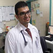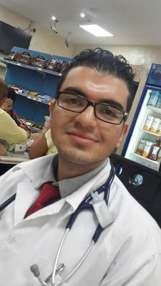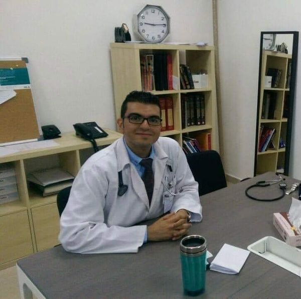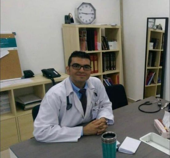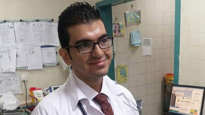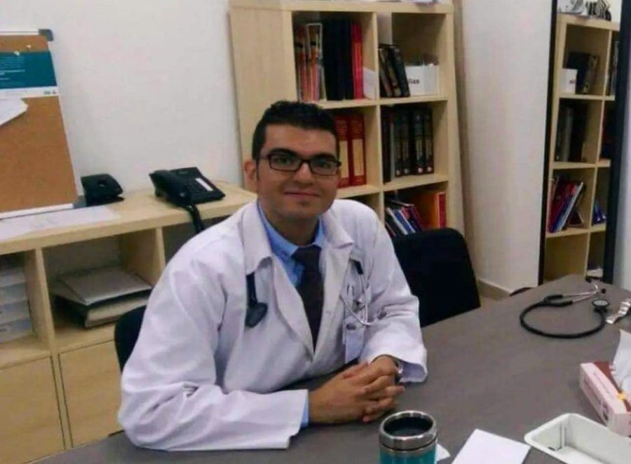 Photos shared of Hammam show a dark haired man in a lab coat, stethoscope around his neck, wearing glasses, with hands clasped on the desk in front of him, as he smiles toward the camera.