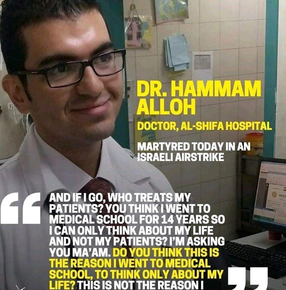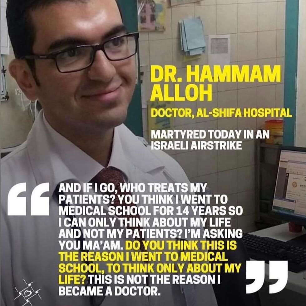 Following his death, on November 13, Democracy Now! aired an interview with a friend and former colleague of Hammam’s, Dr. Ben Thomson. In the interview, Ben said “If he was here talking to you, he would have been very clear about what he wanted…he was an optimist, yes…but he also…faced…very difficult circumstances…every day: seeing his colleagues being killed, working in hospitals with no water, no food, no electricity, knowing that his patients who required dialysis treatment three times a week to survive, knowing that they’d be dead within a week without electricity, all thousand of them throughout Gaza…knowing that, he still went to work.”