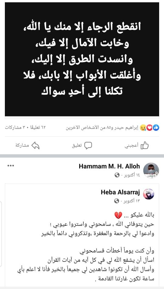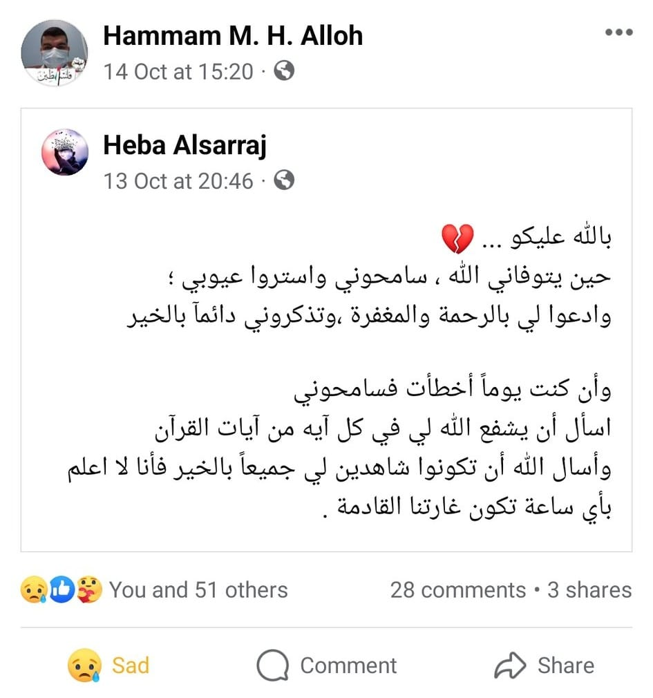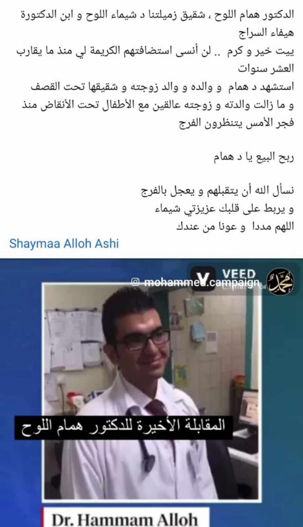 Five days after the attack, Shaymaa Alloh Ashi posted to Facebook, writing “I extend my condolences on behalf of myself and my mother, Dr. Haifa Al-Sarraj, and the children of the martyr, Engineer Mahmoud Al-Louh (Engineer Ala’a, Engineer Hanaa, Engineer Mohammed, and the family of the martyr Dr. Hammam Al-Louh).”
