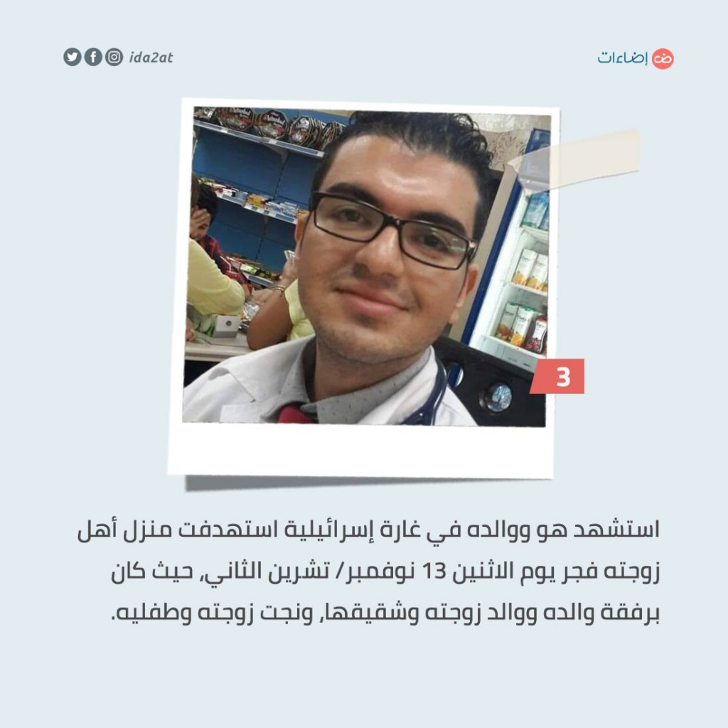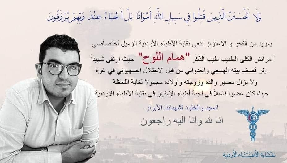 Nour al-Nakhal, wife of Hammam, and their two children, five-year-old Kanan al-Louh and four-year-old Adam al-Louh were also reportedly injured, along with Hammam’s mother, Dr. Haifa al-Sarraj, and Nour’s brother, 37-year-old Dr. Ibrahim Khalil al-Nakhal. Other family members were also reportedly injured, with other individuals said to be missing and stuck under the rubble.