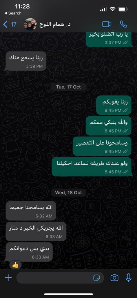Dr. Manar M. Shawabkeh also posted a tribute to Hammam. Writing to Facebook, he wrote “A few days ago, I contacted [Hammam] to check on him and his family.” Attached to the post was a screenshot of a conversation between Hammam and Manar. In it, Manar says “if there is any way we can help, please let us know.” Hammam responded, writing “I just need your prayers.”