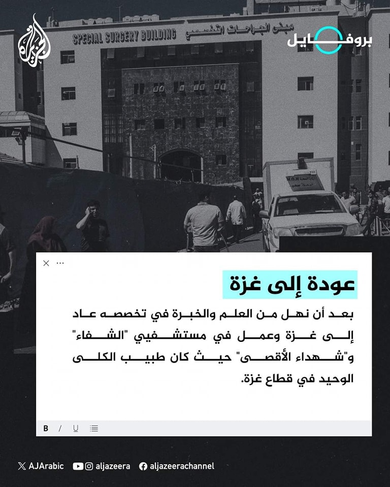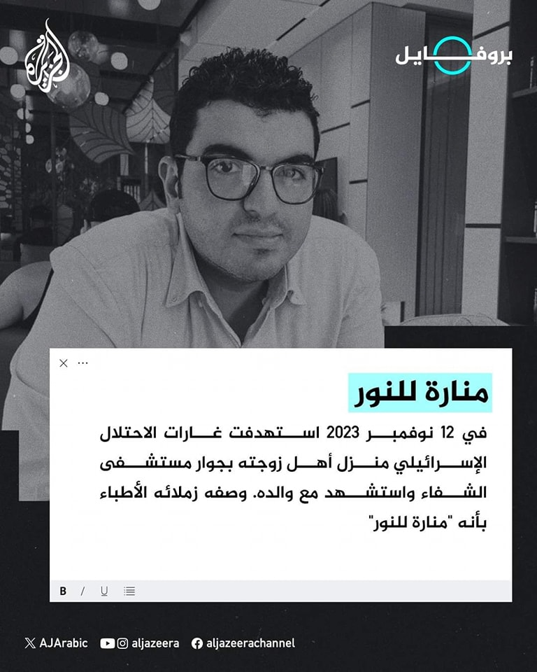 Dr. Khalil al-Nakhal was also grieved, alongside his son, Ahmed. Posting to Facebook, Reema Nakhal referred to Dr. Khalil as “the Director of the Anesthesia Department at Al-Shifa Hospital.”