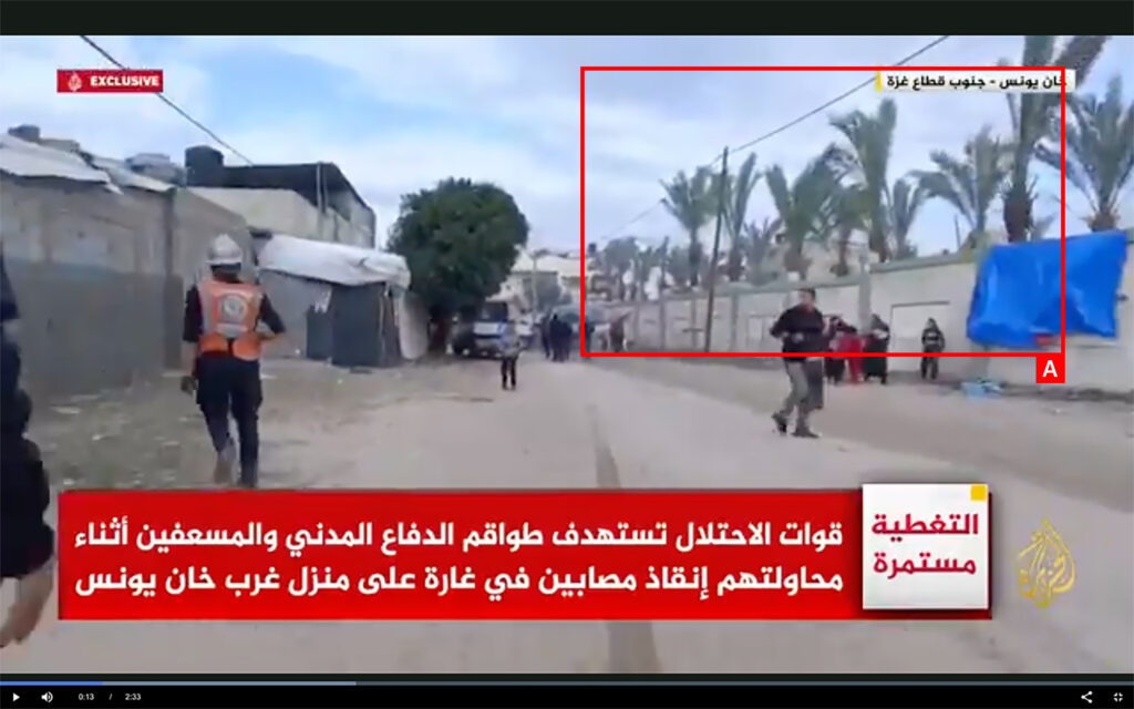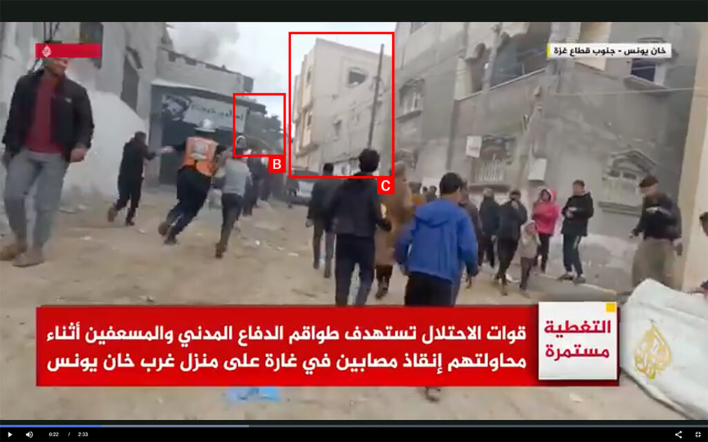 A video filmed by Al Jazeera and reposted in its shorter version by many Twitter/X users and media outlets showed Palestinian Civil Defense crew members rushing towards a house damaged by the earlier strike, being shown how to get inside by children, then entering it to search for survivors and being hit by a powerful explosion while they were inside. The video also showed how two male Civil Defense members who had been injured were assisted by their colleagues to get into an ambulance.