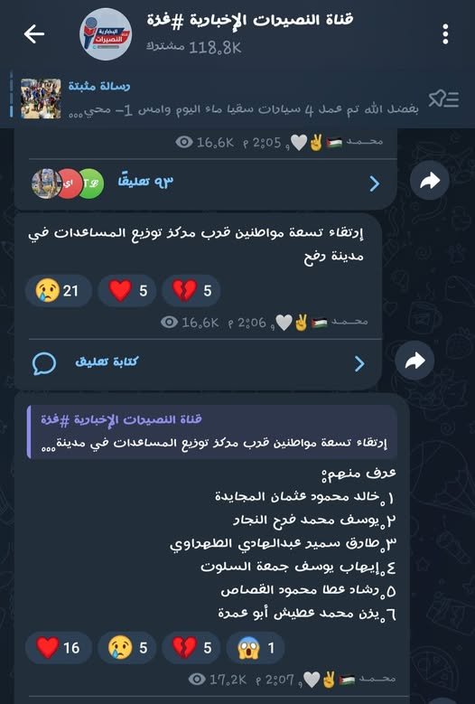 According to Safa News, at least five of the victims’ bodies were taken to Nasser Medical Complex while Abu Ahmed Faraj Allah quoted a source at Nasser who reported “14 martyrs by the fire of the [Israeli] army near the aid centers.” A Twitter/X post from HamlaKaddour included a photo collage of nine of the victims, eight men and one child. A family member of one of the victims, Umm Jamal al-Tahrawi, wrote that 31 people had been killed in the attack.