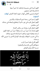 Hani al-Najjar Abu Aouni and Safya al-Najjar prayed for the loss of Yousef al-Najjar, a “martyr of aid” on Facebook posts.