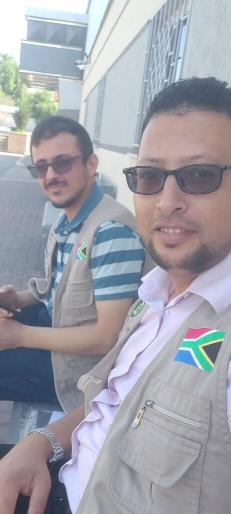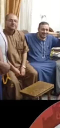 One post included an image of two men with black hair, wearing sunglasses, beige vests, and black trousers, seated on a bench; one man is dressed in a blue-and-white striped shirt, the other in a white shirt. The individual positioned behind is identified as Ahmed. Khalid Alabbasi posted a photograph in memory of his brother or cousin Ahmed, who has black hair, a moustache, and glasses. He is shown wearing a beige vest featuring a South African flag and an unreadable inscription, over a grey sweater and a black-and-white checkered shirt.
