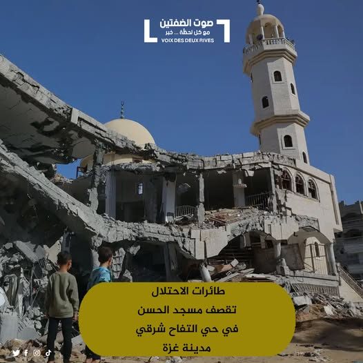 At approximately 4:45am on Thursday, November 16, 2023, 16 civilians, including a child, a woman, and two elderly men, were killed and at least seven civilians were injured during an alleged Israeli airstrike which hit the Al-Hassan Mosque in the Al-Sanafour section in the Al-Tuffah neighbourhood, east of Gaza City.