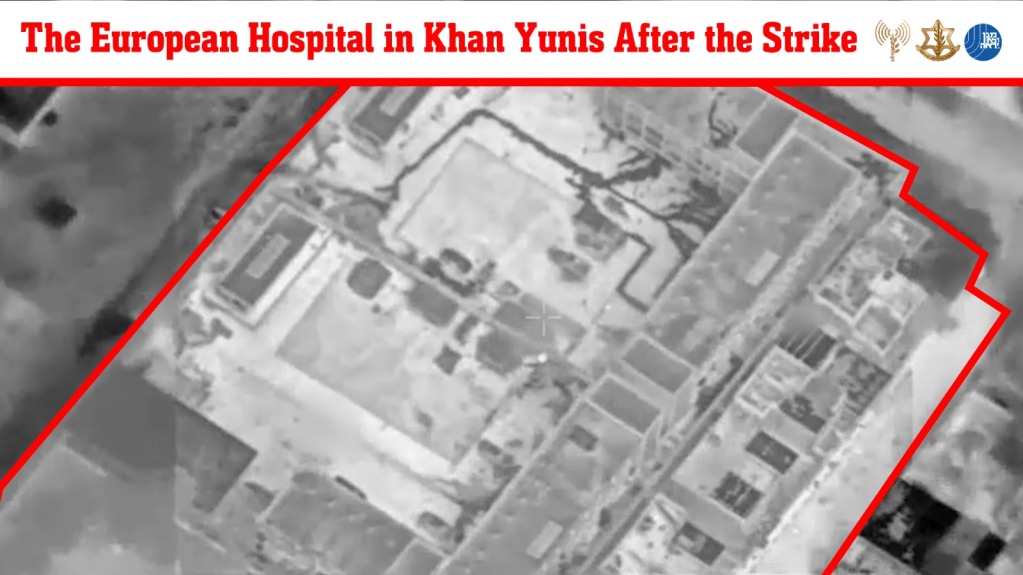 The Israeli Defense Forces released a statement on their official Telegram page that “The IDF and ISA dismantled a Hamas underground terrorist infrastructure site underneath the European hospital in Khan Yunis in southern Gaza.” The post went on to say that “Earlier today (Tuesday), the IDF and ISA conducted a precise strike on Hamas terrorists who were operating in a command and control center that was embedded in an underground terrorist infrastructure site underneath the European hospital in Khan Yunis in southern Gaza.” A video described as showing an “underground terrorist infrastructure site” at the European Hospital and taken from a drone and photo also taken from a drone showing a similar view to the video were included in the announcement.