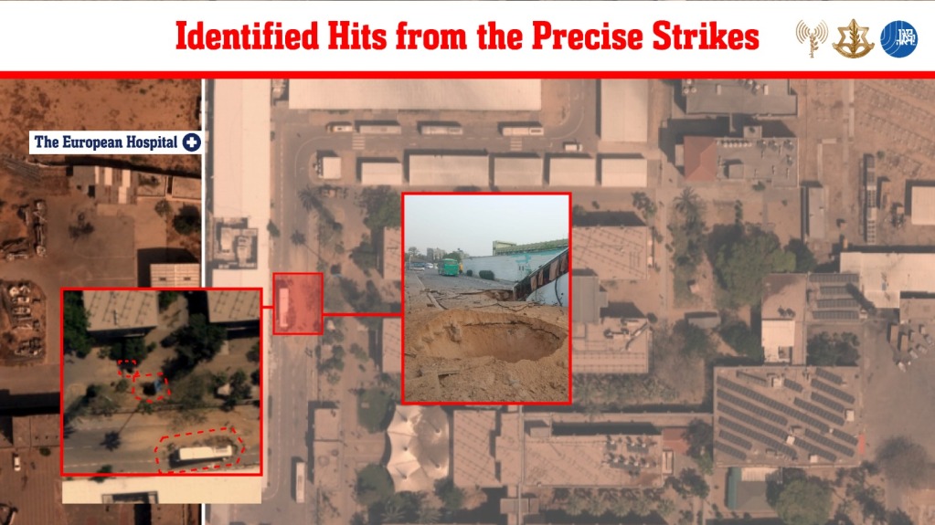 The post from the Israeli military included a video with a map, which highlighted the European Hospital, along with three nearby schools. The video then morphs into an animated illustration of tunnels supposedly under the hospital. Additional images were shared and described as “identified hits from the precision strikes” showing massive craters in the courtyard of the hospital as well as before and after aerial images.