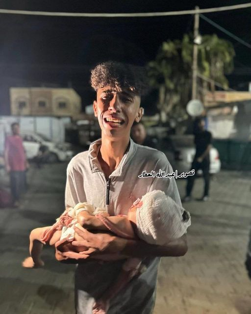 Gehan Mohamed also shared an image of the heartbroken young man with a grimace of pain on his face, carrying the body of the infant in his hands.