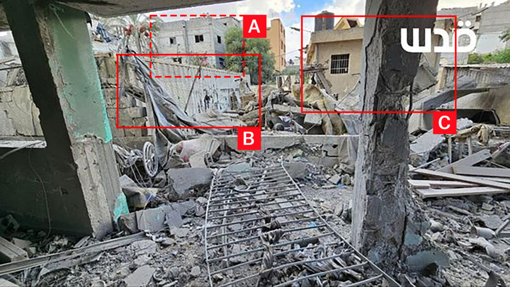 Reports of the incident mention that the Shuhada Al Zeitoun School (مدرسة شهداء الزيتون) was struck in Gaza City (مدينة غزة) . Analysing audio-visual material from sources, we have narrowed the location down to the following exact coordinates: 31.500604, 34.456560.