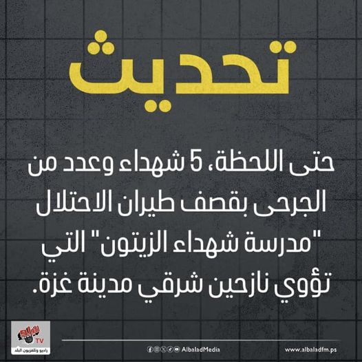 Initial statements by the Civil Defense Authority led sources such as @refugeesps and @SafaPs to report on Twitter/X that at least one or two people were killed at the displacement shelter in the Shuhada Al-Zeitoun School. After medical sources confirmed that the toll had risen to five deceased and six injured, news outlets such as Wattan News and Al Balad News Network published updated incident reports. Facebook user Maryam Ahmed specified that some of the injuries were “serious” but the extent of the injuries was not known. No sources provided identification for any of the victims.