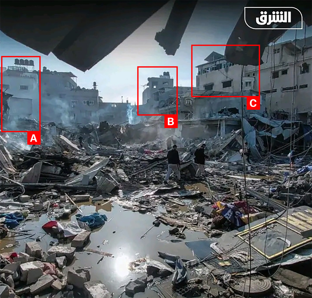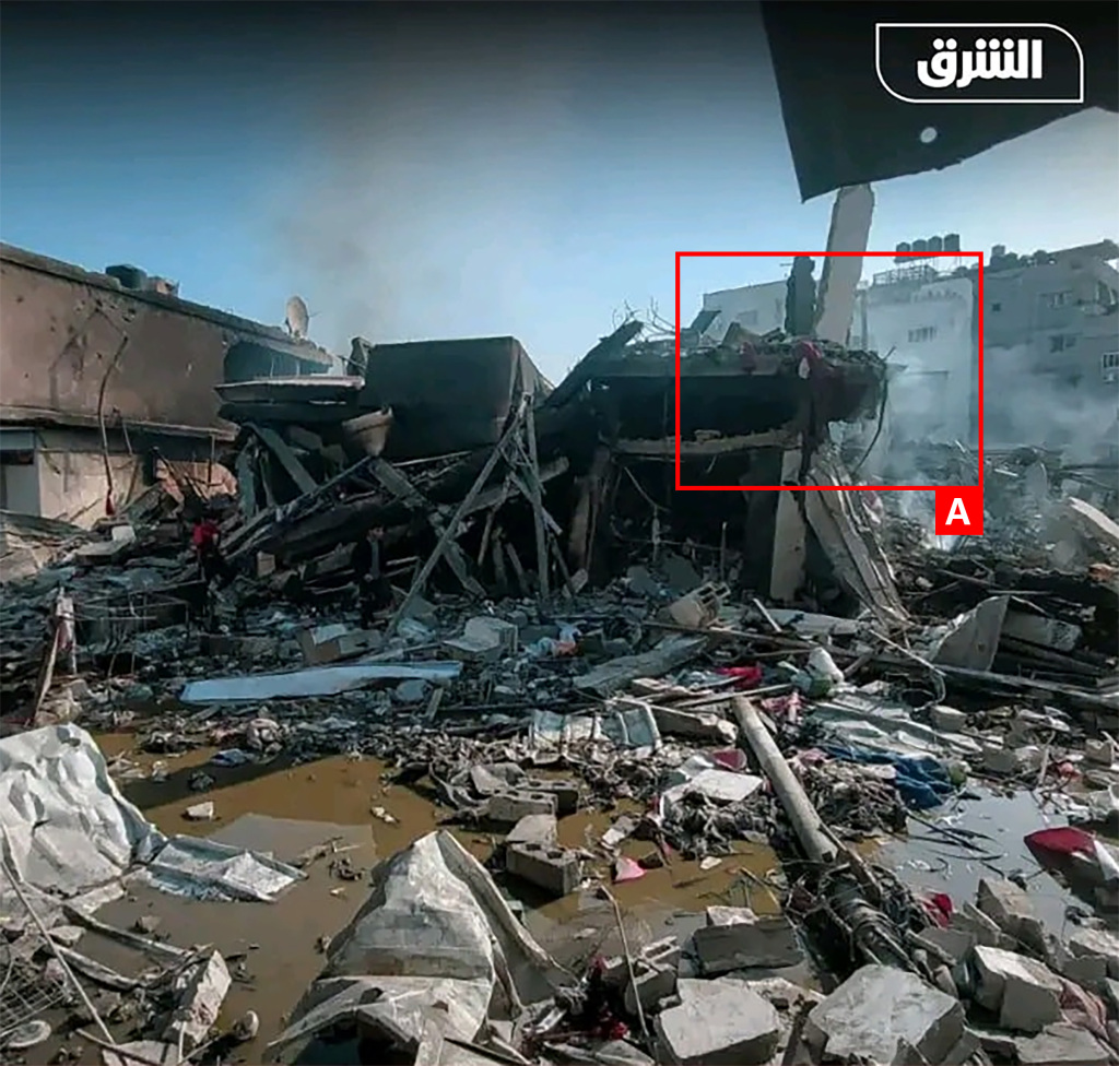 Reports of the incident mention the Trans area (الترنس) being struck in the Jabalia Refugee Camp (معسكر جباليا). Analysing audio-visual material from sources, we have narrowed the location down to the following exact coordinates: 31.531479, 34.496332.