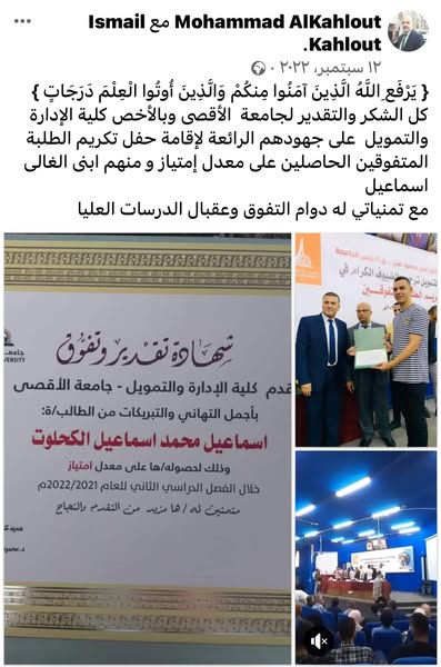 Other members of the family also posted their condolences on social media. On Facebook, Ahmed al-Kahlout wrote that Ismail al-Kahlout had ‘just graduated from university with honours and got engaged’. He also shared a picture of Ismail wearing a suit and smiling at the camera. This picture was accompanied by screenshots of an older Facebook post from Ismail’s father Mohammed al-Kahlout depicting Ismail receiving his university degree. Mohammed wrote that his ‘dear son Ismail’ had received a distinction in his degree and had been amongst the top students in this class. Mahmoud M Elmadhoun posted a picture of himself and Ismail smiling at the camera, in memory of his ‘brother [..] and dear friend’.