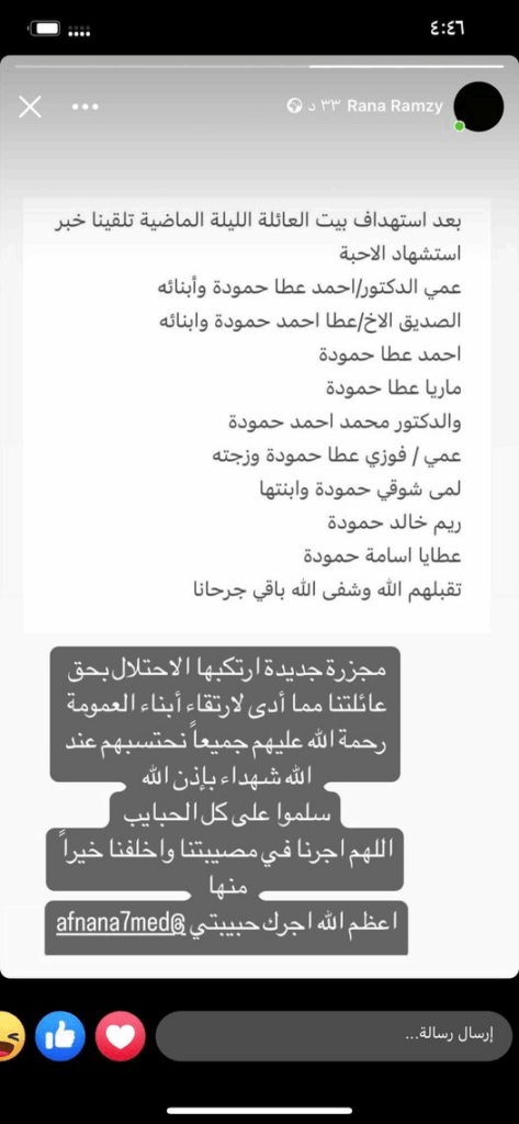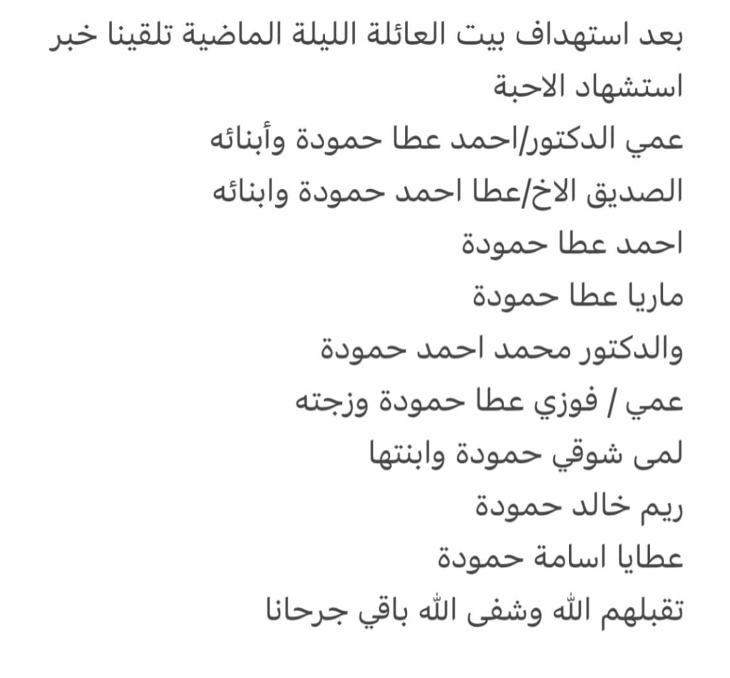 67-year-old Dr. Ahmed Atta Hamouda was killed alongside his sons, 36-year-old Atta Ahmed Hamouda and 27-year-old Dr. Muhammad Ahmed Hamouda. Atta Ahmed Hamouda’s six-year-old son, Ahmed Atta Hamouda, and two daughters, three-year-old Maria Atta Ahmed Hamouda and an infant Malak Atta Ahmed Hamouda, who was just eight months old, were also killed in the incident. Ahmed’s 62-year-old wife, Muna Hamouda, was injured.