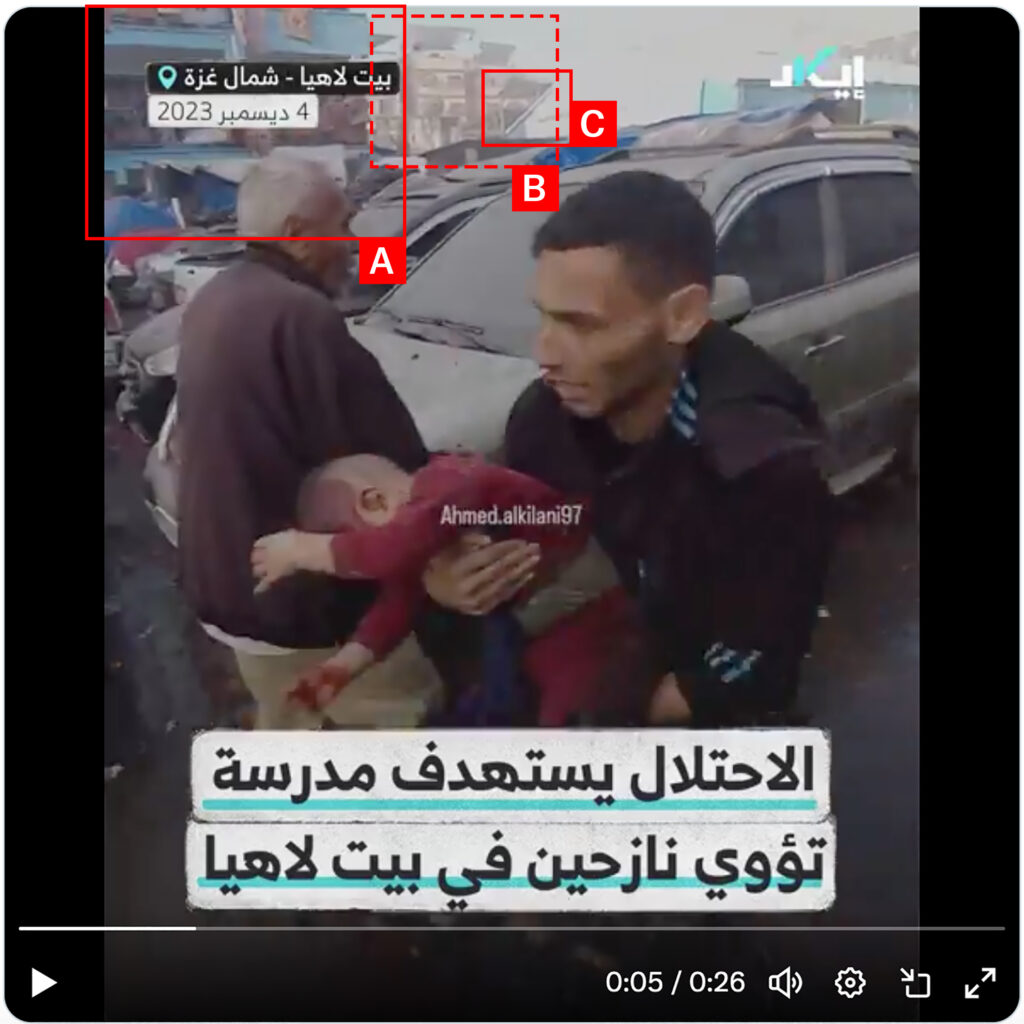 Reports of the incident mention that the Khalifa bin Zayed School (مدرسة بنات بيت لاهيا) was struck in Beit Lahia (بيت لاهيا). Analysing audio-visual material from sources, we have narrowed the location down to the following exact coordinates: 31.543076, 34.500848.