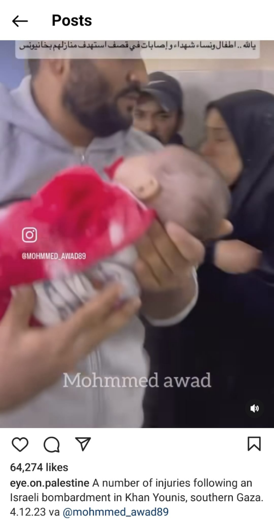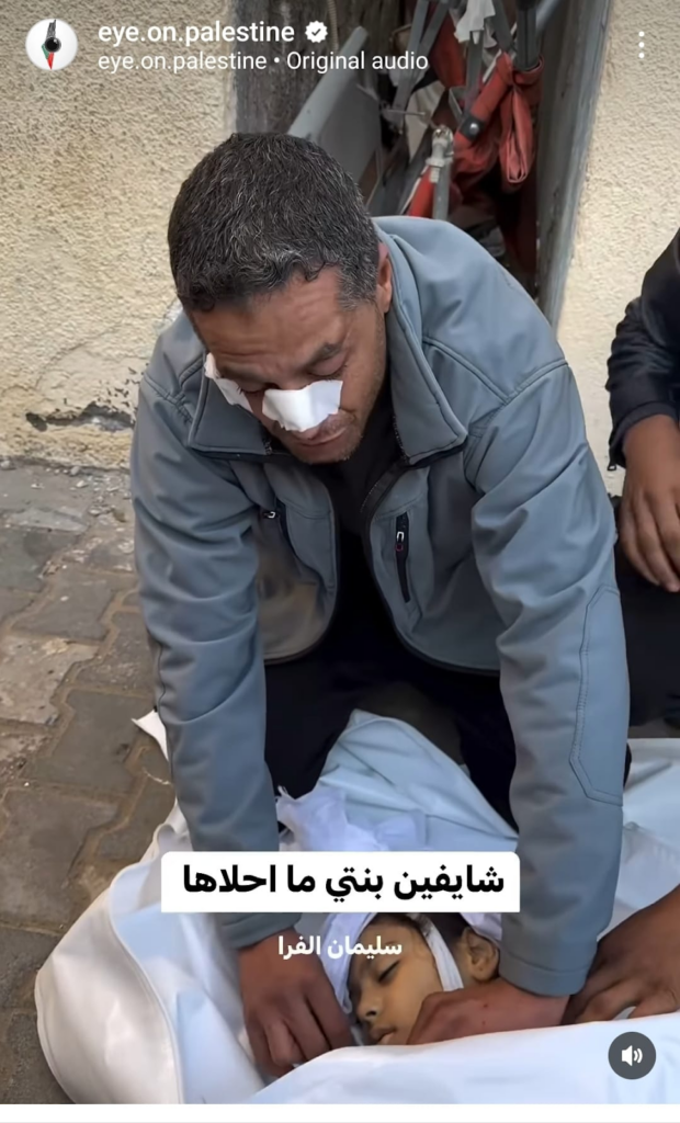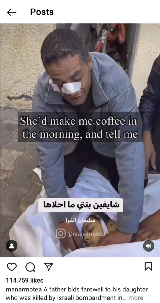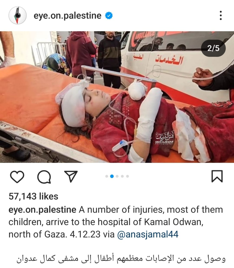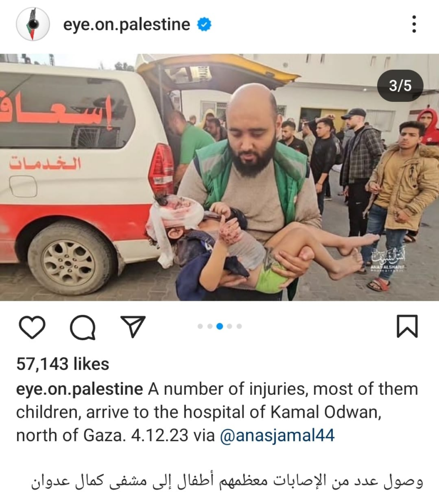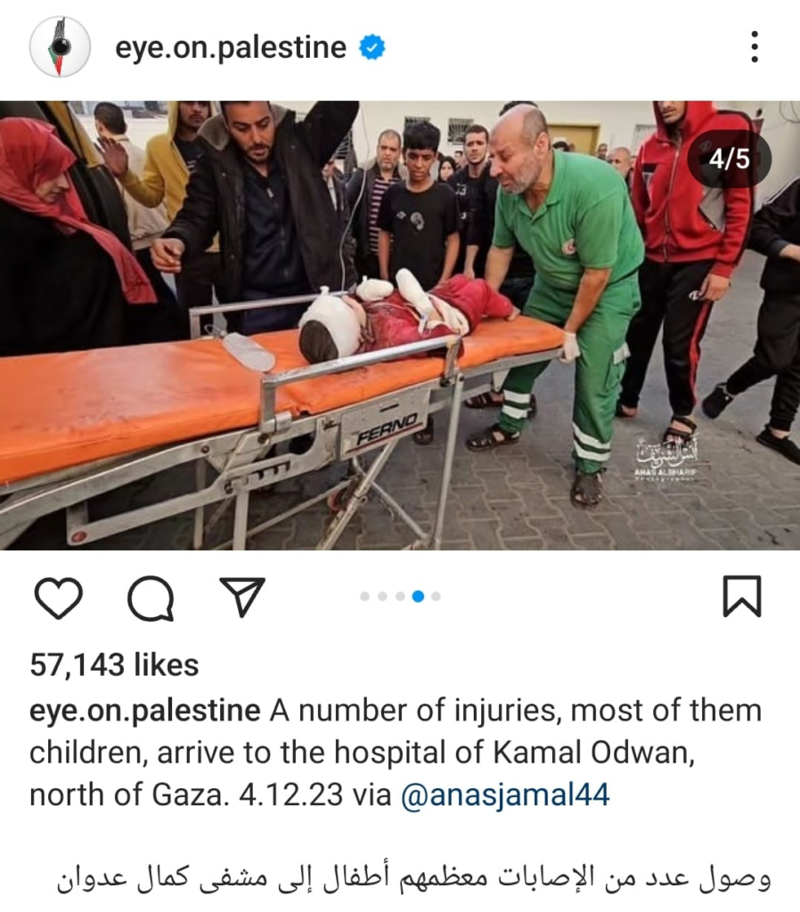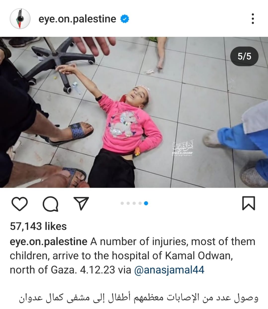 The Eye on Palestine Instagram account, in screenshots shared by Facebook user Nourhan Farouk, noted that “a number of injuries, most of them children, arrive[d] to the hospital of Kamal Odwan, north of Gaza” and shared a photo of a young girl with bandages on her face, hands, and abdomen lying on a gurney. Another screenshot shows a medical worker carrying a very young wounded child with bandages and blood on his face into the hospital. A further screenshot shared shows a man crying over a child’s shrouded body, likely that of his daughter. The post’s caption relates the father’s memories of his daughter making him coffee: “She’d make me coffee in the morning (…) I’d tell her, yes, your coffee tastes better, Mays”.