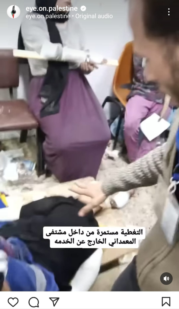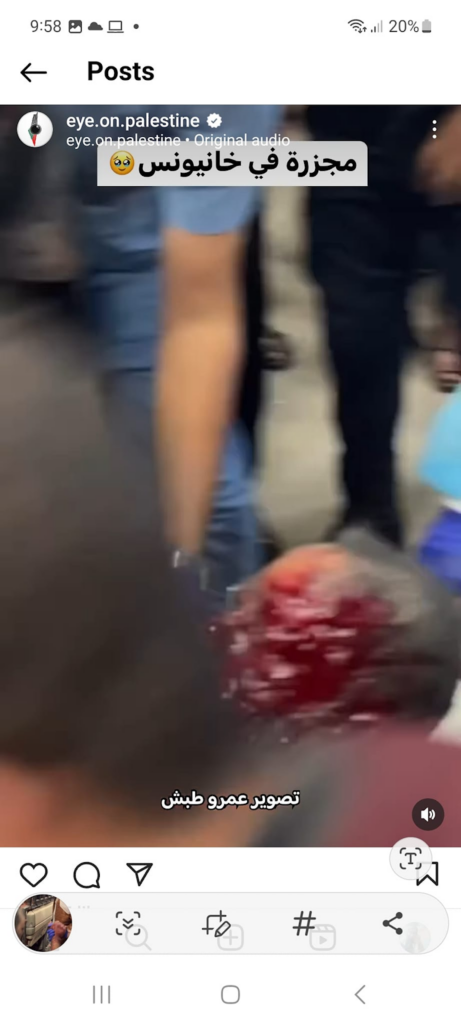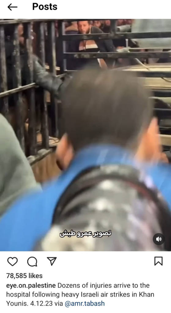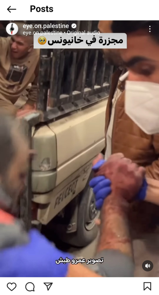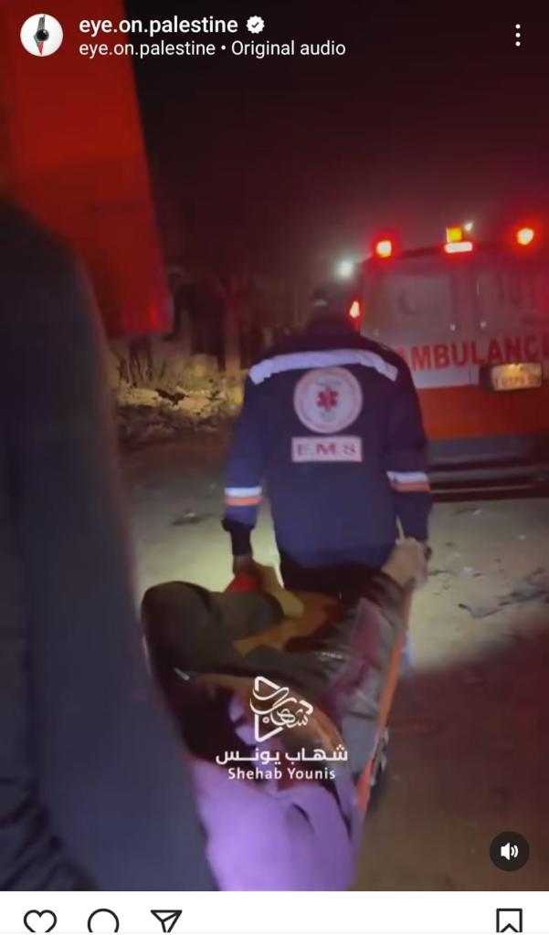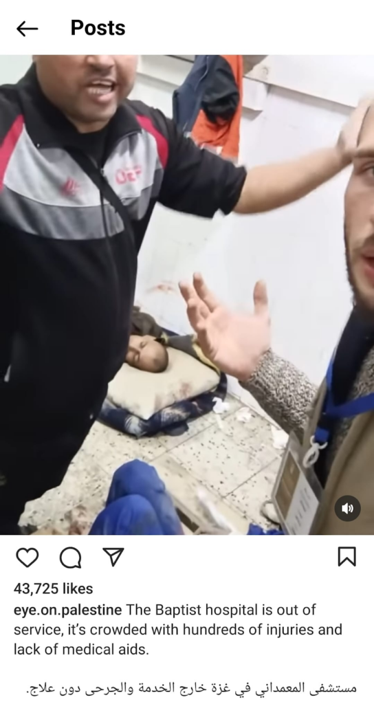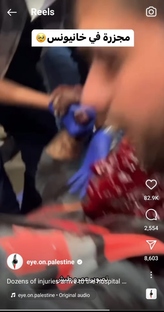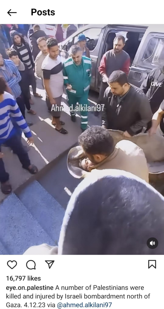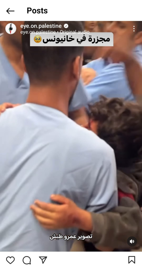 The Eye on Palestine Instagram account, in screenshots shared by Facebook user Nourhan Farouk, noted that “a number of injuries, most of them children, arrive[d] to the hospital of Kamal Odwan, north of Gaza” and shared a photo of a young girl with bandages on her face, hands, and abdomen lying on a gurney. Another screenshot shows a medical worker carrying a very young wounded child with bandages and blood on his face into the hospital. A further screenshot shared shows a man crying over a child’s shrouded body, likely that of his daughter. The post’s caption relates the father’s memories of his daughter making him coffee: “She’d make me coffee in the morning (…) I’d tell her, yes, your coffee tastes better, Mays”.