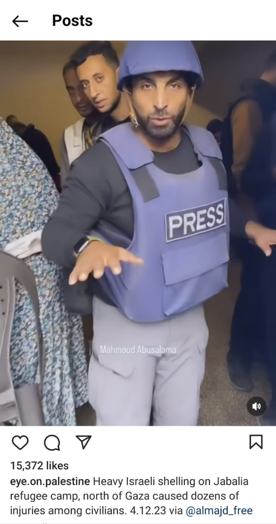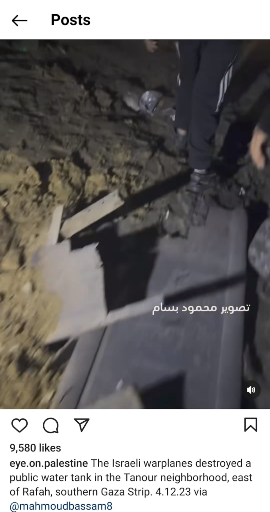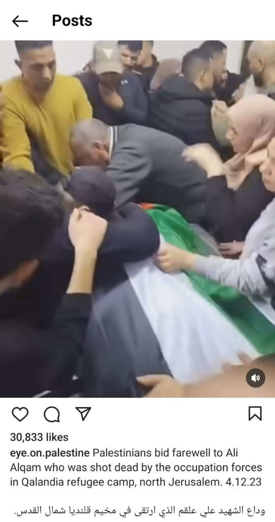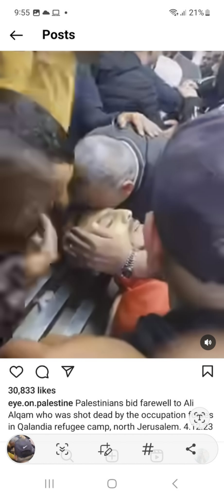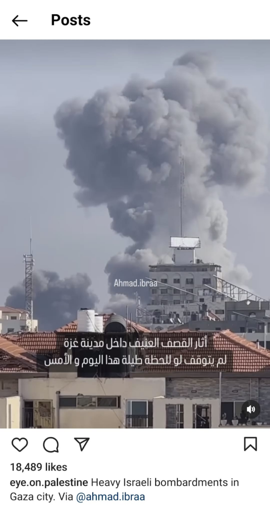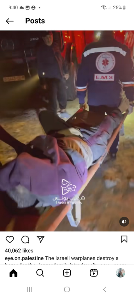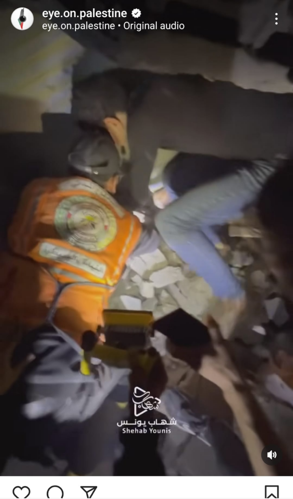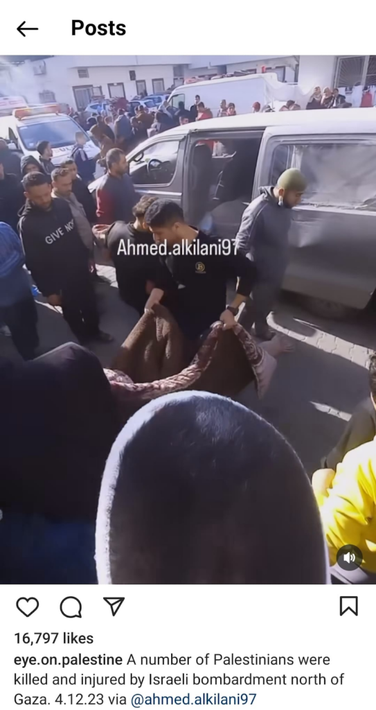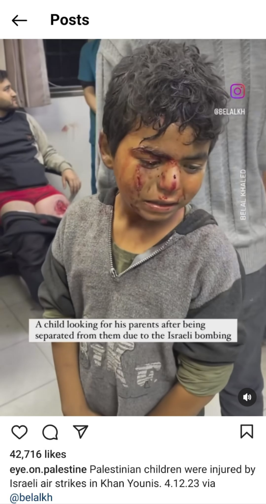 The Eye on Palestine Instagram account, in screenshots shared by Facebook user Nourhan Farouk, noted that “a number of injuries, most of them children, arrive[d] to the hospital of Kamal Odwan, north of Gaza” and shared a photo of a young girl with bandages on her face, hands, and abdomen lying on a gurney. Another screenshot shows a medical worker carrying a very young wounded child with bandages and blood on his face into the hospital. A further screenshot shared shows a man crying over a child’s shrouded body, likely that of his daughter. The post’s caption relates the father’s memories of his daughter making him coffee: “She’d make me coffee in the morning (…) I’d tell her, yes, your coffee tastes better, Mays”.