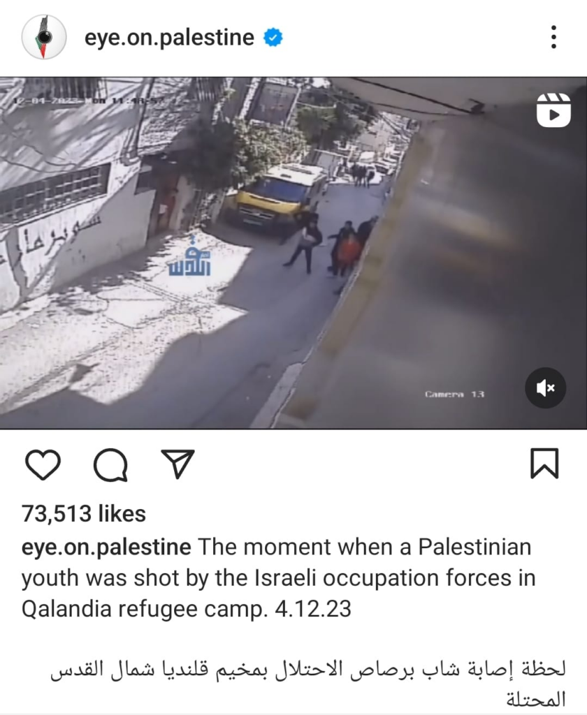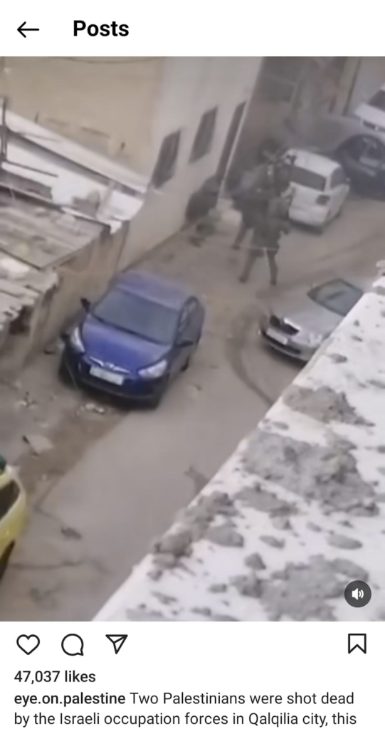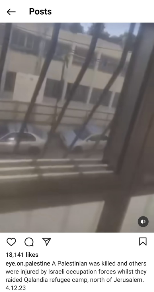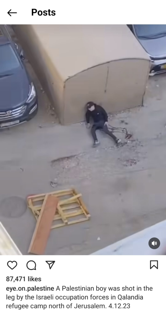 It is unclear whether every screenshot shared by user Nourhan Farouk captures this specific strike, or whether these also include other attacks. One screenshot shows Emergency Medical Services (E.M.S) carrying a man on a stretcher, it is unclear whether he is alive, which appears to have been taken at night. All other images show the attack occurred during daylight hours. Another screenshot shows a man leaning against a wall with blood trailing from his leg. It is possible that the video, taken from above, is showcasing the aftermath of a ground operation, as the man was possibly shot. This is corroborated by a later image, shared by the same user, that purports to show a young man being shot by Israeli soldiers in Qalandia, which is in the West Bank. Though it is unclear whether both these images are of the same man, it supports the likelihood that not all images shared relate to the alleged airstrike on Khalifa Bin Zaid School. Casualties that appear possibly linked have been added to maximum ranges only.