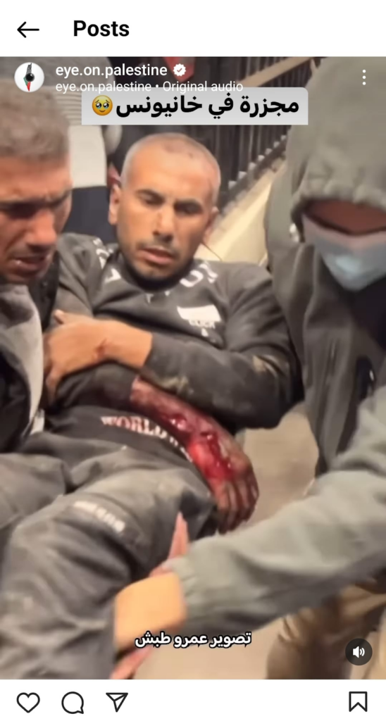 Another screenshot by the same account shows two young men who seem to be in the middle of talking or asking for help and a middle-aged man laying on a bloody mattress on the ground in a hospital. It is unclear if he is injured or deceased. Another round of screenshots show teenagers and adults transporting an injured or lifeless man in a blanket, rushing him to a hospital.