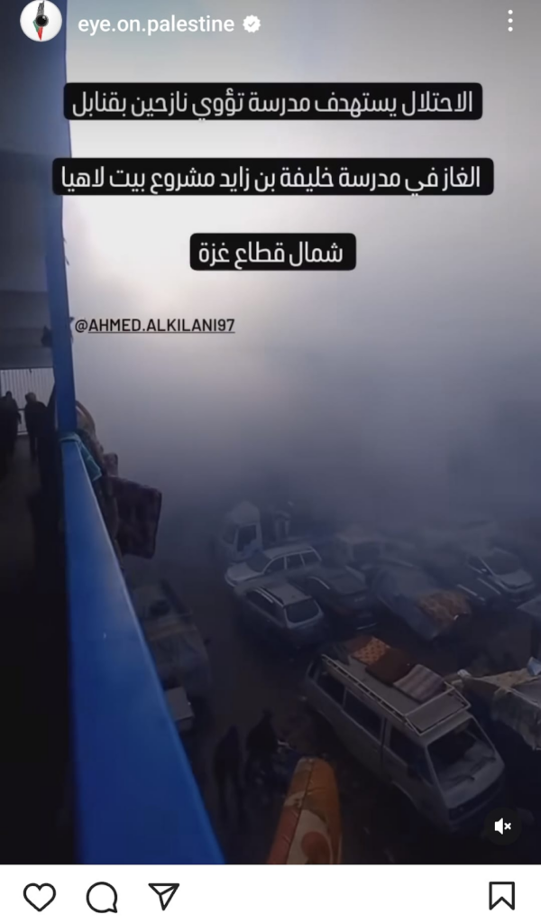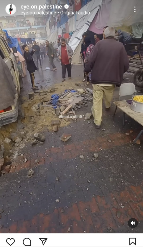 Journalists shared videos on platforms such as @AJA_Palestine showing the extent of the destruction. The videos show complete devastation in the courtyard of cars, building parts, and what looks to be resulting burn marks from the fires ignited by the airstrike. Other videos right after the strike show smoke billowing out above the makeshift tents in the school such as the video shared by @alwakeelnews on Twitter/X. This user alleged that “gas bombs” were used in the strike.