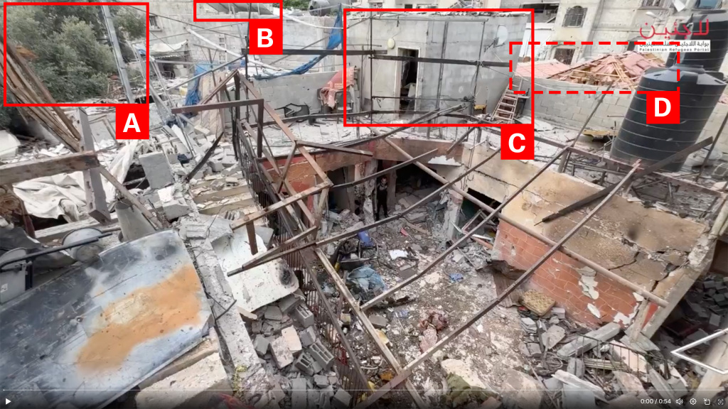 Reports of the incident mention a residential building being struck in the Al-Maghazi Camp (مخيم المغاز). Analysing audio-visual material from sources, we have narrowed the location down to the following exact coordinates: 31.421478, 34.386767.