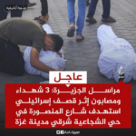 At 11:00, a Safa correspondent reported at least three Palestinians killed alongside a resulting “number of injuries” from an alleged Israeli military bombing of a group of citizens in the east of Gaza City. Aljazeera confirmed the numbers and location of the alleged shelling on Al-Mansoura Street near the Hassan building, which killed three people. Various other independent and news sources confirmed this throughout the day: “At least three citizens were killed and a number of others injured as a result” from the reported Israeli bombardment (Hani Alshaer on Facebook).