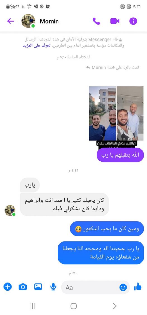 Former students of Dr. Anwar Shahada Nassar also mourned the death of their professor and his son, including additional pictures of the two. Ahmed Wasfy described Dr. Anwar Nassar as “My Sheikh, my love, my doctor, the father of my friends”, and Khaled Fetiha wrote “my teacher and role model, who raced for good in all situations”. Khaled added “By God, we knew you only as conservative, upright, worshipful, ascetic, and memorizers of the Book of God. Words fail to describe you.”