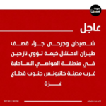 The incident was reported by Al Jazeera Arabic, who also tweeted a video of the aftermath of the strike where a group of women and children are crying while being checked on and civil defense teams can be seen carrying a body on a stretcher. In another video, posted by Alarabiya Palestine, a young man is seen mourning over a body, and he is described as being the son of the man who was killed in Mawasi.