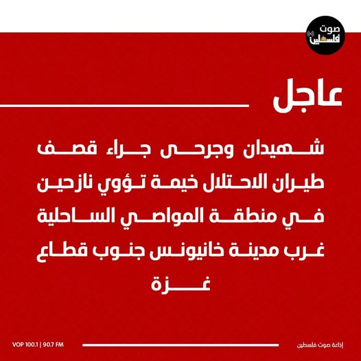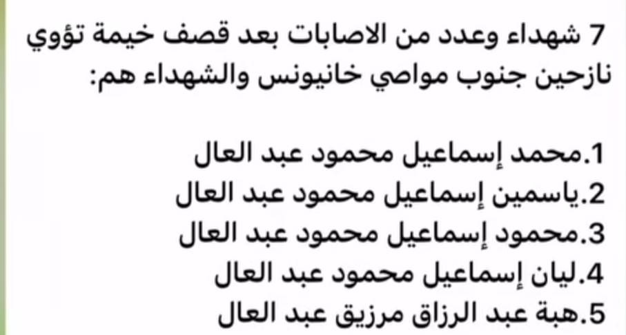 The Palestinian Center for Human Rights reported that “At approximately 1:00 PM, an Israeli helicopter attacked a tent belonging to an internally displaced person on a plot of land in the western part of Al-Mawasi, southwest of Khan Younis. The shelling killed seven residents, including a girl and four of her young siblings, and injured others, three of whom were seriously injured. The martyrs were: Wafaa Ismail Mahmoud Abdel Aal, 18, and her siblings Layan Ismail Mahmoud Abdel Aal, 2, Yasmin Ismail Mahmoud Abdel Aal, 13, Mohammed Ismail Mahmoud Abdel Aal, 16, and Mahmoud Ismail Mahmoud Abdel Aal, 15.” Rama Hazem Ahmed Abu Hamid, 14, and Mohammed Salah Mohammed Hajila, 32 were also among those killed, and the following day, the child Yassin Mohammed Fayez Al-Shaer, 13, was declared dead after succumbing to his wounds from the shelling.
