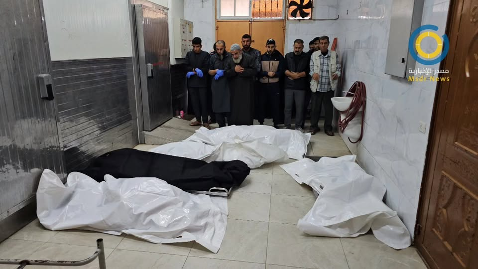 Masdr Al Ikhbaria shared to Facebook a news update and pictures of the bodies of the dead wrapped in white cloth.