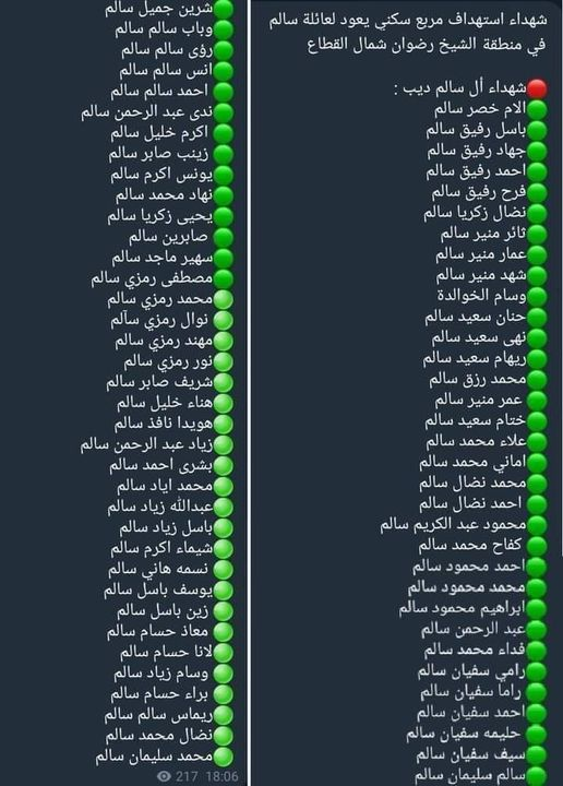 A family relative Ramy salem wrote: “107 martyrs so far and still missing under the rubble?” Another family relative, Ahmad Salem, alleged that the death toll was higher – according to him, about 130 members of his family were killed, including his uncles and aunts, and their children. A Facebook user Ana Safaa estimated that the number of the victims killed was even higher, up to 200, writing that “a large number of the family were martyred, approximately 200 martyrs, and a large number are also seriously injured.”