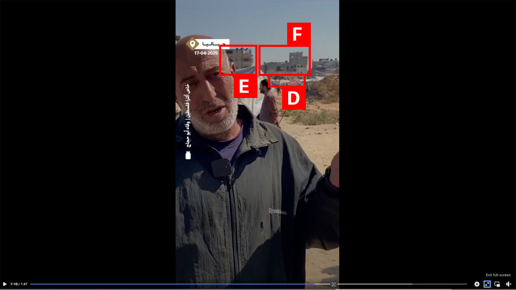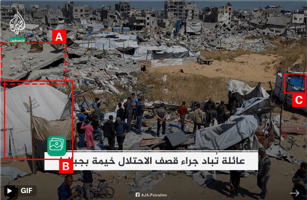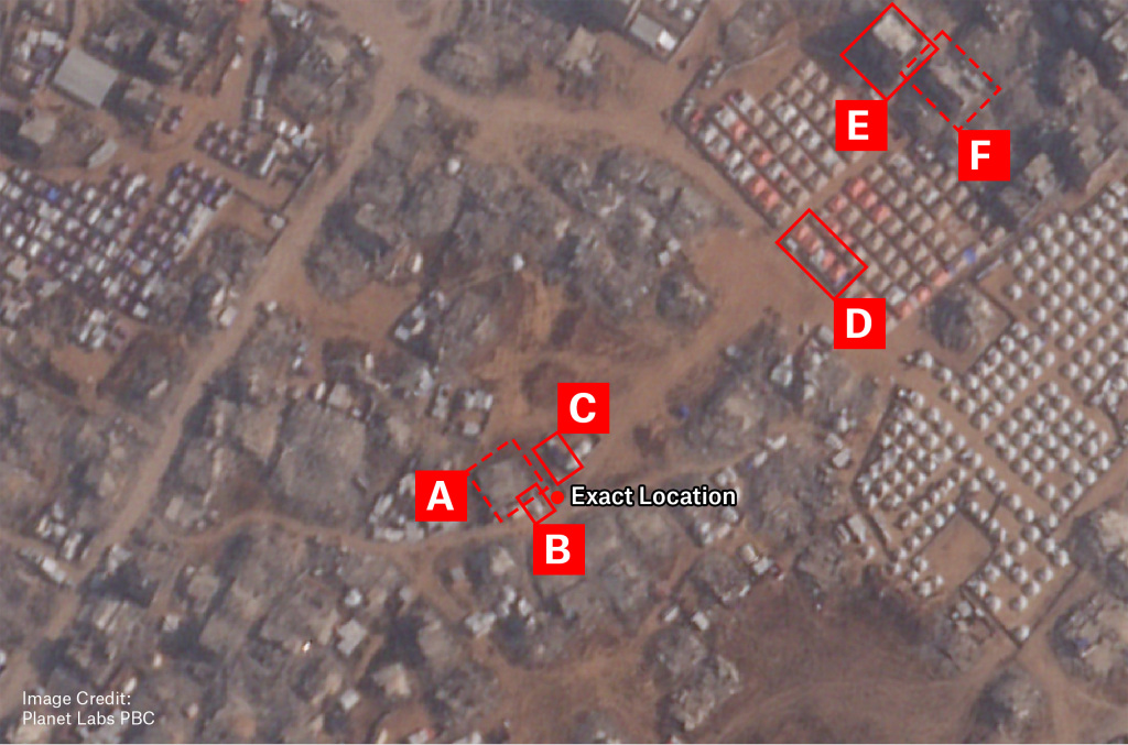 Reports of the incident mention a tent being struck on Al-Dakhiliya Street (شارع الداخلية) in the Jabalia Refugee Camp (مخيم جباليا). Analysing audio-visual material from sources, we have narrowed the location down to the following exact coordinates: 31.526740, 34.495352.