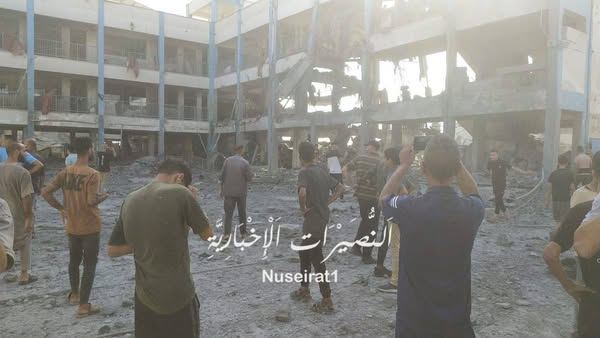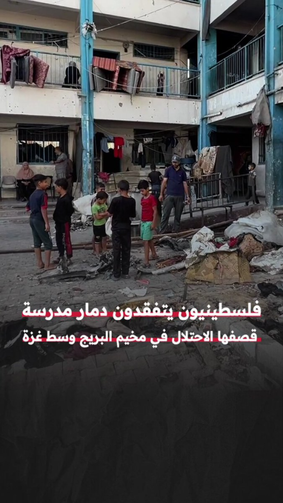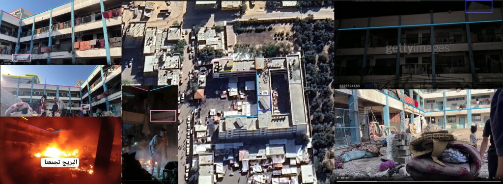 Reports of the incident mention a strike on Abu Helou school (مدرسة ابو حلو) in the Bureij camp (مخيم البريج). This incident was independently geolocated by Anno Nemo (@NemoAnno). Satellite imagery shows the strike location at the following exact coordinates: 31.435442, 34.400635.