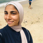 Zein Mahmoud Abu Watfa, who appears to be a teenager, is wearing a grey t-shirt and grey pants. He poses with his 17-year-old sister Hala Mahmoud Abu Watfa, wearing a beige hijab and a navy blue dress on a sunny day at the beach.