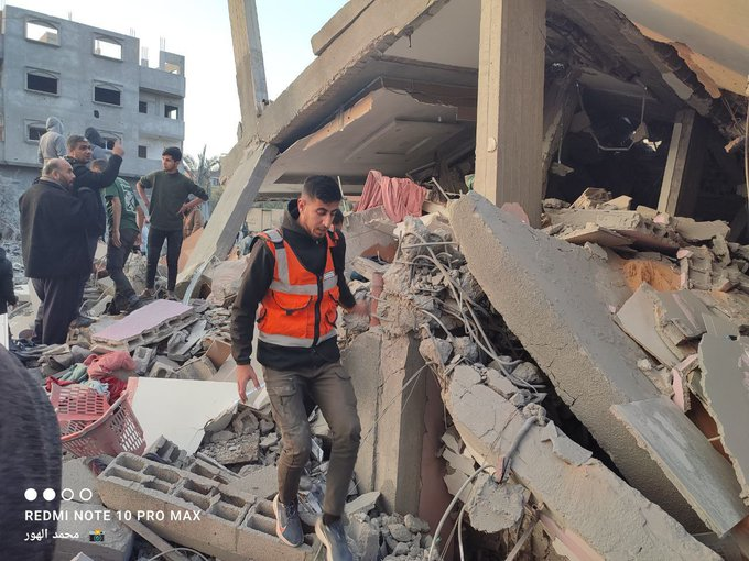 Additional social media users, including @El_manshar, shared images from the aftermath of the strike, showing the destroyed residential building, people climbing over rubble, and destruction in the targeted area.