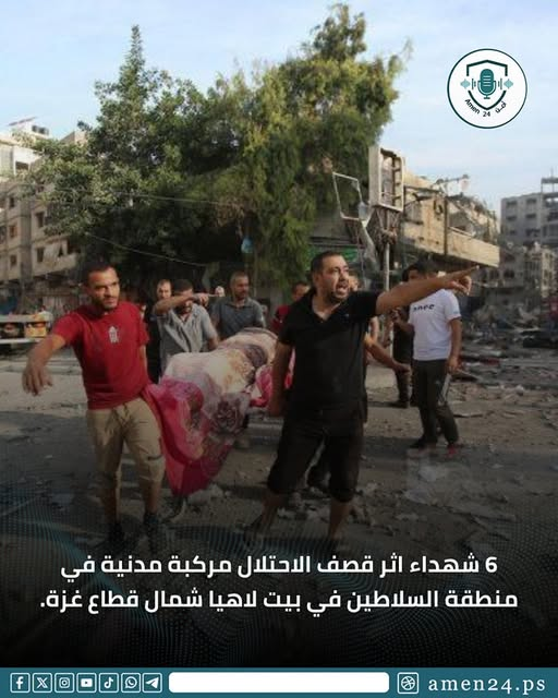 Twitter/X account @PalinfoAr reported the incident at 11.30 a.m., noting that six deceased victims were brought to the Indonesian hospital after an attack on the civilian vehicle in the Al-Sultan area in Beit Lahia.
