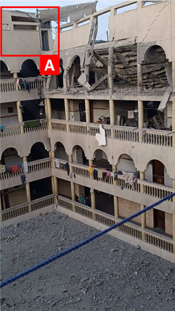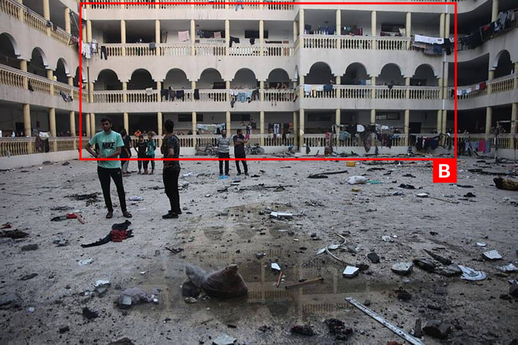 Reports of the incident mention the Al-Tabi’in School (مدرسة التابعين) in the Al-Daraj neighbourhood (حي الدرج) in Gaza City (مدينة غزة). Analysing audio-visual material from sources, we have narrowed the location down to the following exact coordinates: 31.518775, 34.464331.