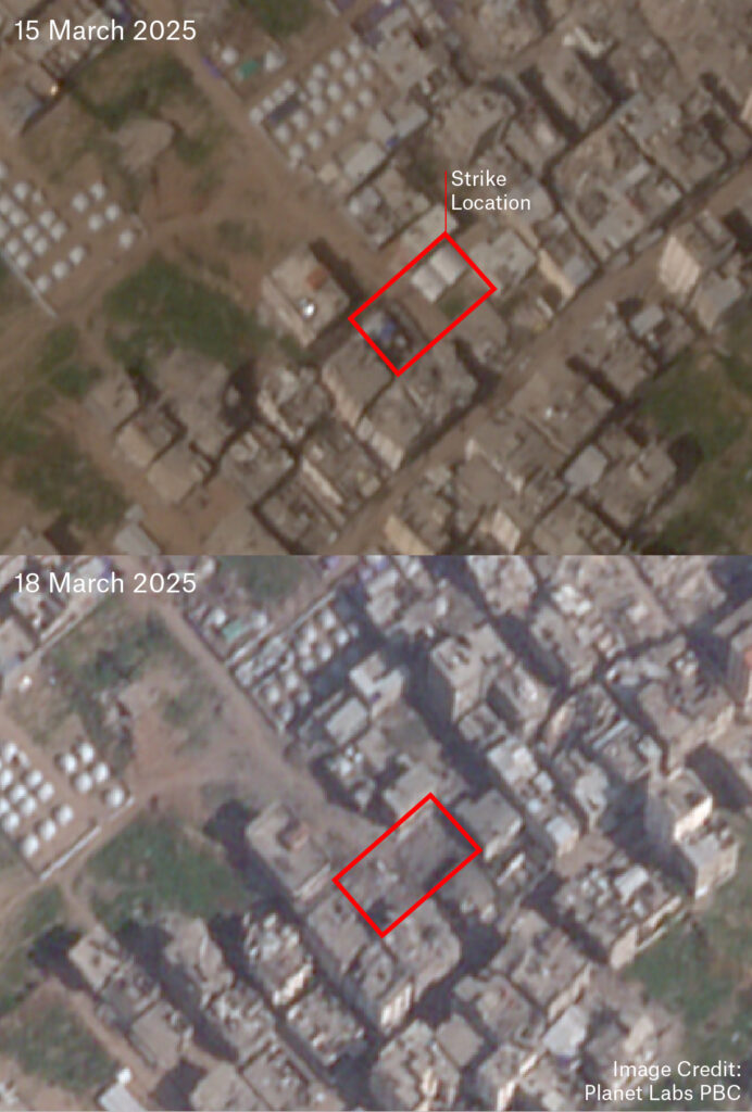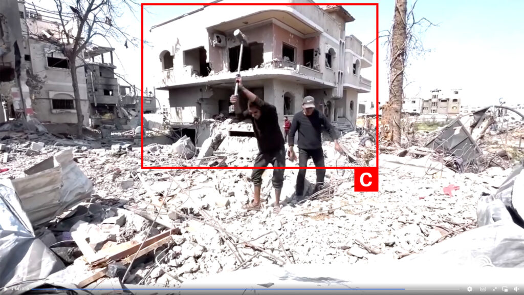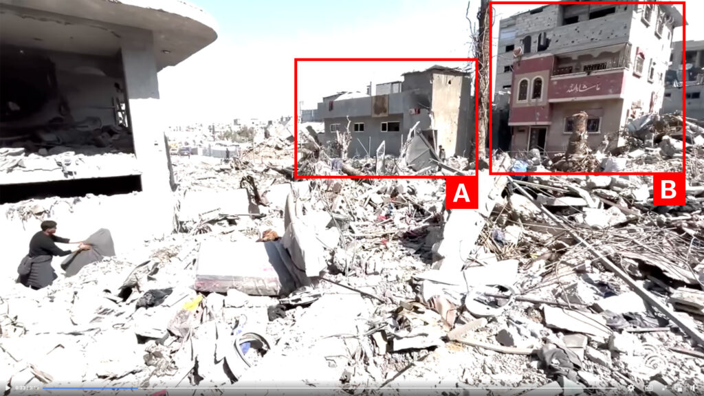 Reports of the incident mention a residential building being struck in the vicinity of Wadi Al-Arais Street (شارع وادي العرايس) in the Shujaya neighbourhood (الشجاعي) in Gaza City (مدينة غزة). Analysing audio-visual material from sources, we have narrowed down the location to the following exact coordinates: 31.494454; 34.465307. Due to limited imagery, we couldn’t identify the exact building of the family home.