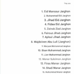 72-year-old Eid Mansour Jarghon, was killed with his sons, 38-year-old Jihad Eid Jarghon and 41-year-old Mohammed Eid Jarghon, and daughter, 42-year-old Fidaa Eid Jarghon. Jihad’s wife, 31-year-old Zainab Ziad Jarghon, was killed, along with the couple’s two daughters, six-year-old Fairuz Jihad Jarghon and four-year-old Aylol Jihad Jarghon. Mohammed’s wife, 33-year-old Majdoleen Abu Luli (Jarghon) was also killed. Three of Eid Mansour’s grandchildren were also killed, likely Mohammed’s children: four-year-old Maryam Mohammed Jarghon, three-year-old Bisan Mohammed Jarghon and two-year-old Lian Mohammed Jarghon.