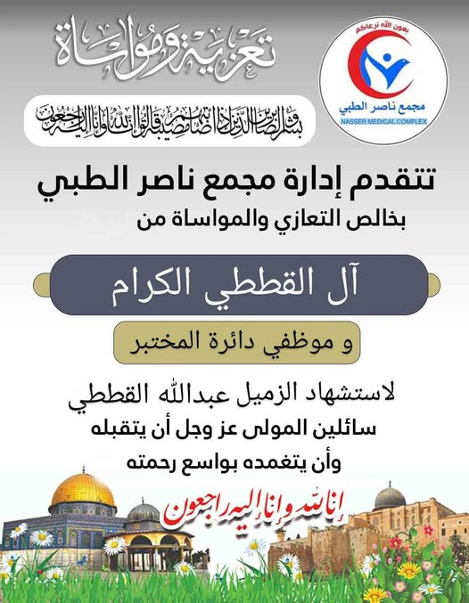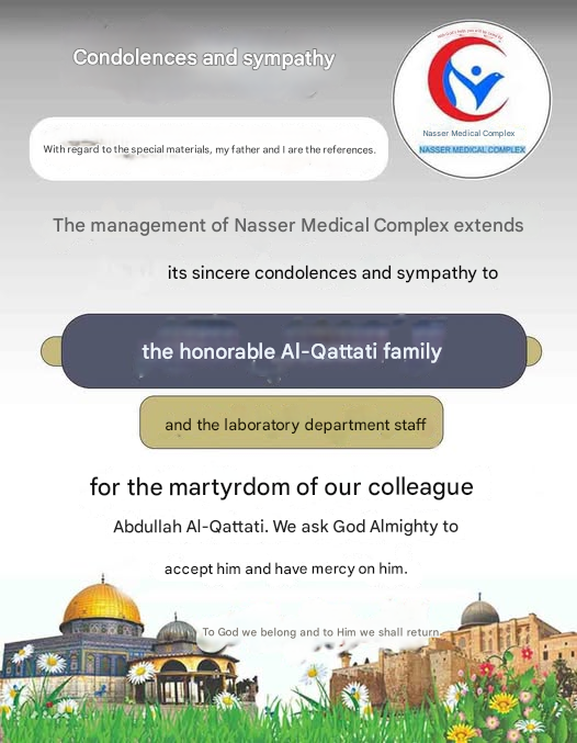 The Nasser Medical Complex also issued an official condolence statement for Abdullah, confirming his death as one of their staff. Colleagues and friends, including Omar Adwan, Ahmad Mohamed Abu Wateen, and Mohammed Khaled, shared posts honoring his character and professionalism.