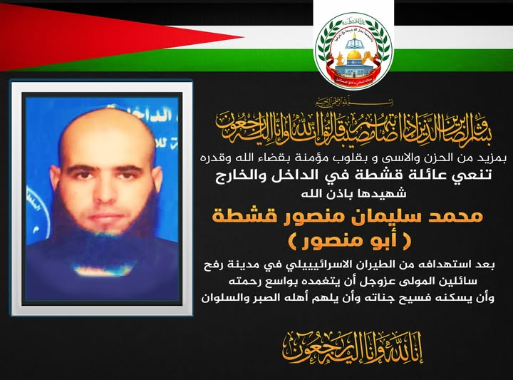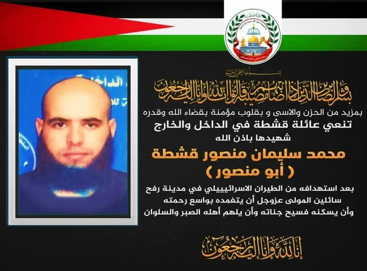 Multiple family and community posts confirmed his death. The Facebook account The Qishta family inside and outside announced that Mohammed Suleiman Mansour Qishta was killed “by Israeli aircraft in the city of Rafah” at the age of 38. A series of relatives identified him as their cousin, including Mahmoud Abu Jamal Qishta, Ahed Qeshta, Bassam Qishta, Mahmoud al-Sayyed Qishta, Amro Qishta, Jafar Mohammad Qishta, Basel Qishta, Memati Qishta, and Ahmad Qishta. Each offered condolences and prayers, describing him as a beloved family member, while Kamal Qishta specifically referred to him as a “dutiful son” to his parents.
