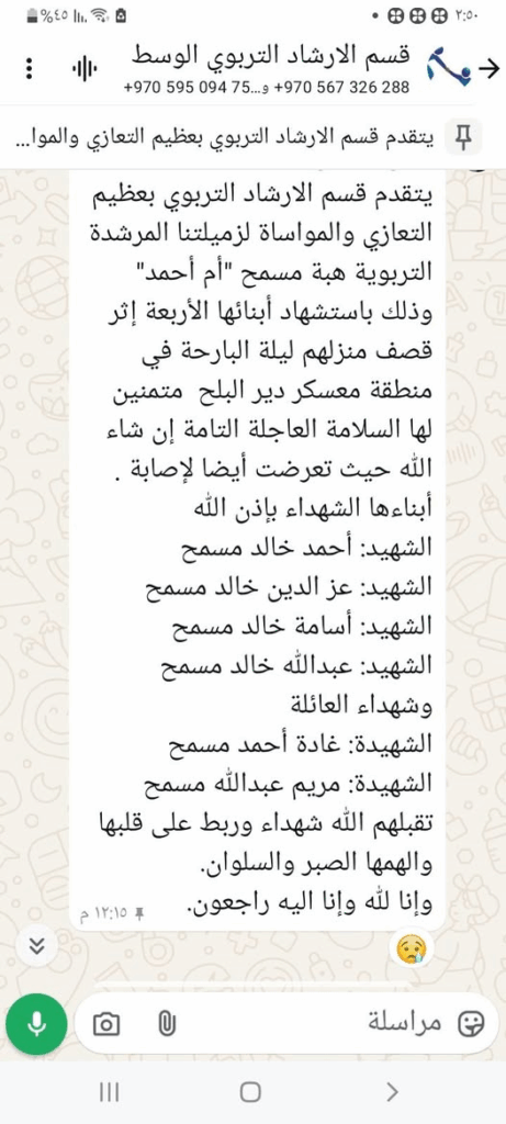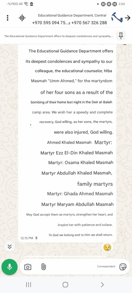 Najwa Ahmad Abu Samra, a colleague of Hiba Masmeh, reported her injury and shared a message of condolence for the loss of her four sons in the airstrike. Najwa shared a screenshot of a WhatsApp message sent to Hiba on behalf of her workplace, the Educational Guidance Department. The message sent Hiba well wishes to recover soon from her injuries as a result of the airstrike, and named the members of her family who had been killed in the attack and sent prayers on their behalf.